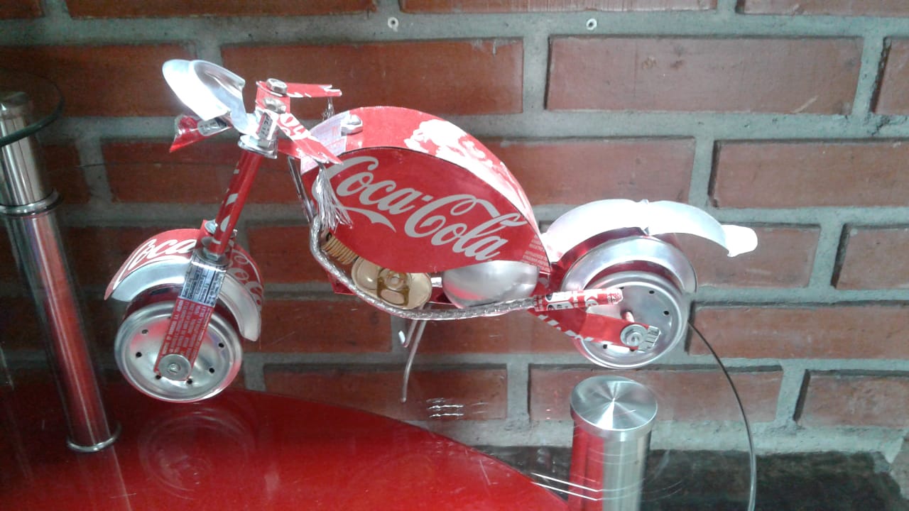 Motocicleta, fabricado con latas de aluminio reciclado,