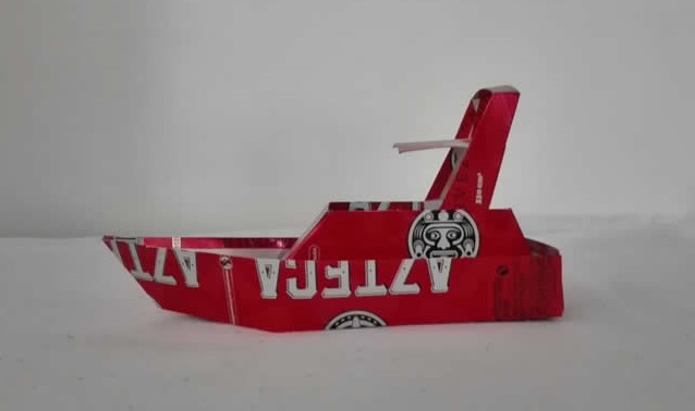 Barco canoa, fabricado con latas de aluminio reciclado,