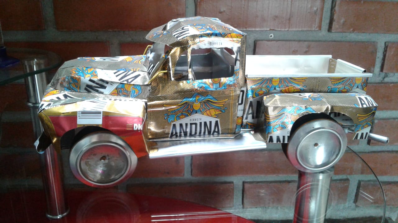 Camioneta picap de los 70, fabricado con latas de aluminio reciclado,
