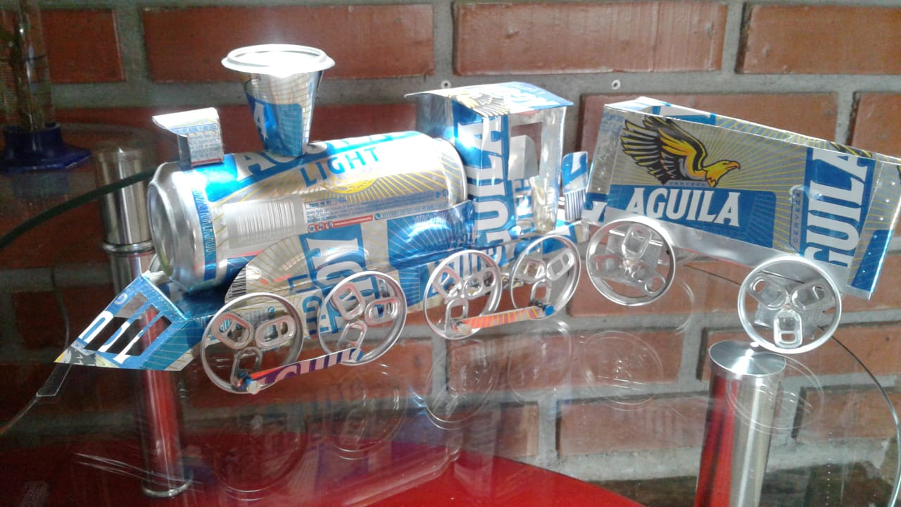 Tren, fabricado con latas de aluminio reciclado,